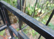 Последовательность работы стандартная. Во-первых, сжечь старую краску, во-вторых, зачистить ограду до металла, после покрыть грунтом чистый металл и покрасить черной краской. После покраски убраться на могиле. Далее на фото обожженная краска на ограде.